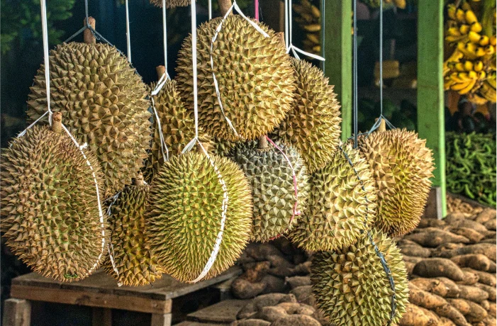 Le Cambodge regorge de trésors tropicaux grâce à son climat fertile. Sur les étals des marchés, les fruits sont rois : des classiques mangues (particulièrement sucrées) aux plus exotiques comme le ramboutan, le mangoustan ou le célèbre durian à l’odeur si particulière.