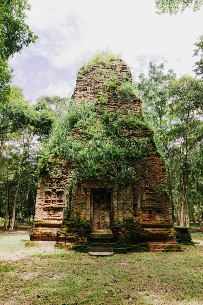 Contrairement aux temples d’Angkor, construits principalement en grès, Sambor Prei Kuk se distingue par l’utilisation magistrale de la brique. Le site compte plus de 150 temples, dont beaucoup ont une forme octogonale unique, une caractéristique rare dans l’architecture hindouiste d’Asie du Sud-Est.